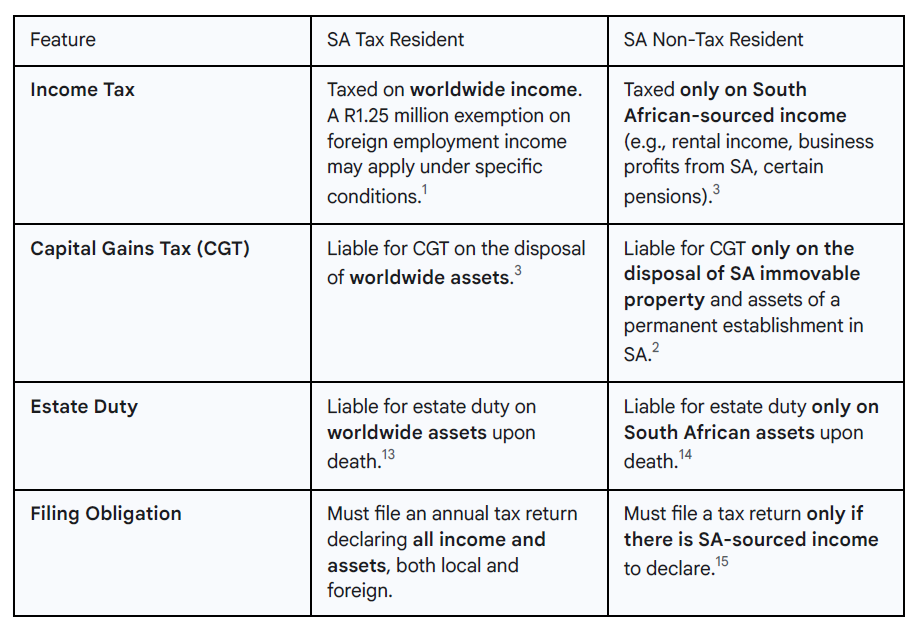 A South African tax resident is liable for tax on their worldwide income and is subject to Capital Gains Tax (CGT) on the disposal of their worldwide assets. In contrast, a non-resident is only taxed on income from a South African source (for example, rental income from a property in South Africa) and on capital gains from the disposal of South African immovable property.